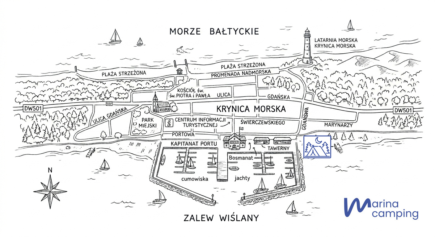 Camping Marina to wyjątkowe miejsce położone bezpośrednio nad Zalewem Wiślanym, w pierwszej linii brzegowej. Oferujemy 39 przestronnych stanowisk dla kamperów, przyczep i namiotów – wszystkie z dostępem do prądu, wody i kanalizacji. Latem camping tętni życiem dzięki lokalizacji w marinie, a poza sezonem staje się oazą ciszy i spokoju.